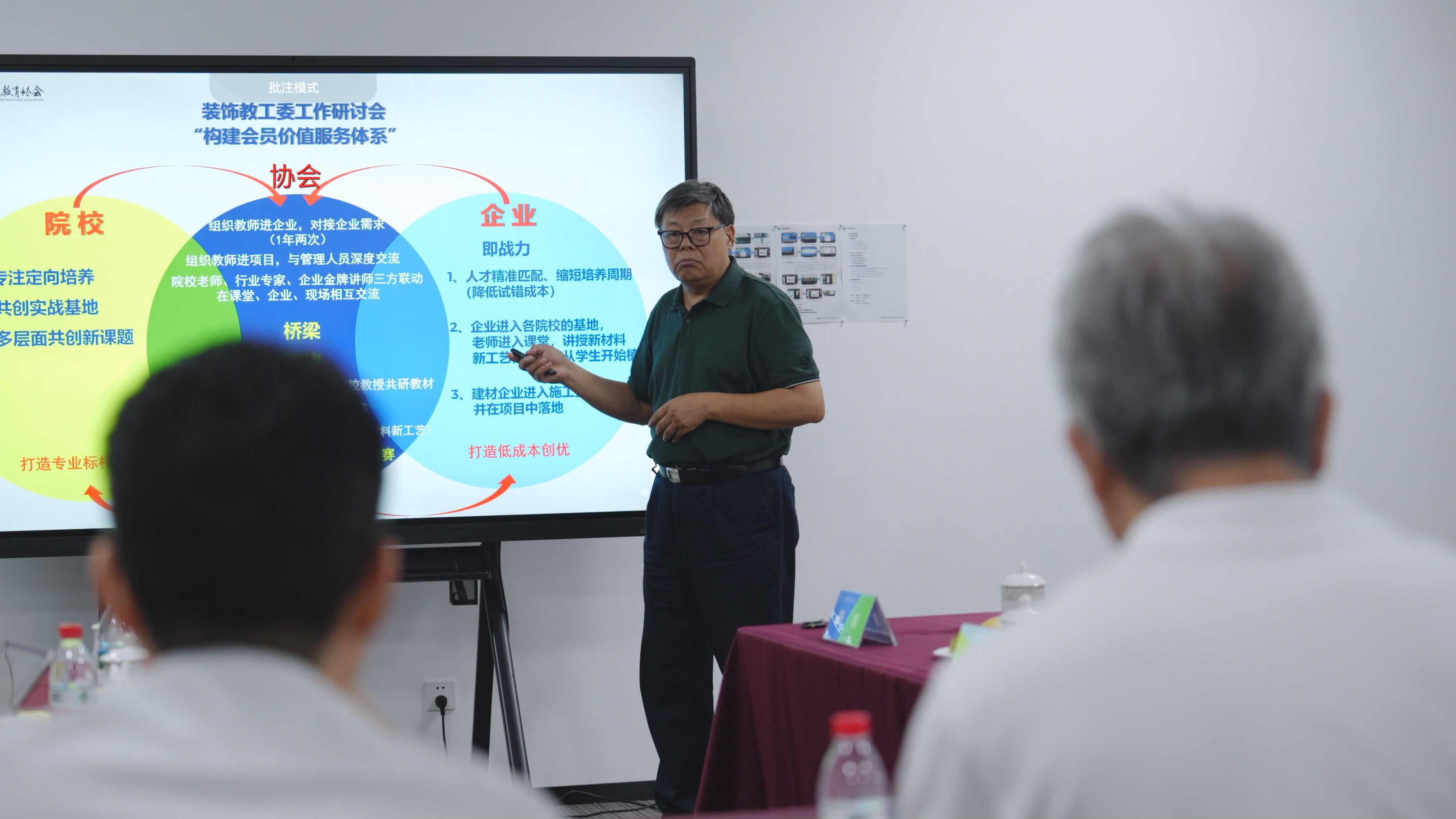 针对装饰行业人才短缺,装饰工匠队伍青黄不接,装饰职业教育滞后于技术、管理以及材料的快速发展。2025年4月19日,中国建设教育协会在深圳召开装饰教育工作委员会成立大会。会议提出校、企共建“双师双场”模式,推动“行业精英进课堂,院校学者入项目”,探索“论文写在工地上,课堂走进项目里”等新型教培模式。经过三个多月的调研走访,装饰教工委举办了全方位、多层次的研讨会,广泛听取了职业教育院校、装饰企业、行业协会等各方面意见和建议,初步形成了工作方案。此次研讨会任务之一就是深入探讨专委会成立对会员的价值所在。