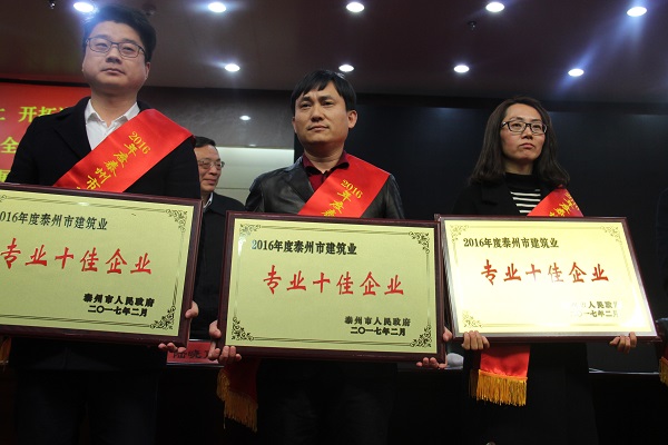 我会双建公司、瑞兴公司、中装建设获得泰州建筑业“十佳专业企业”奖;海田公司、金环球公司获得泰州建筑业“专业先进企业”奖。