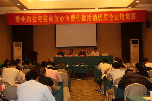 5月25日,首批申报住宅装修行业放心消费创建优质企业培训班在泰州举行。江苏省住建厅装饰装修发展中心主任、省装协秘书长高枫,泰州市住宅装修行业放心消费领导小组组长、泰州市建工局副局长王京陵,泰州市放心消费创建办负责人于春宏,首批申报放心消费创建优质企业的50家装饰、建材企业代表80多人参加培训。培训班分别由市装饰装修行业协会副会长潘明军、严志云主持。