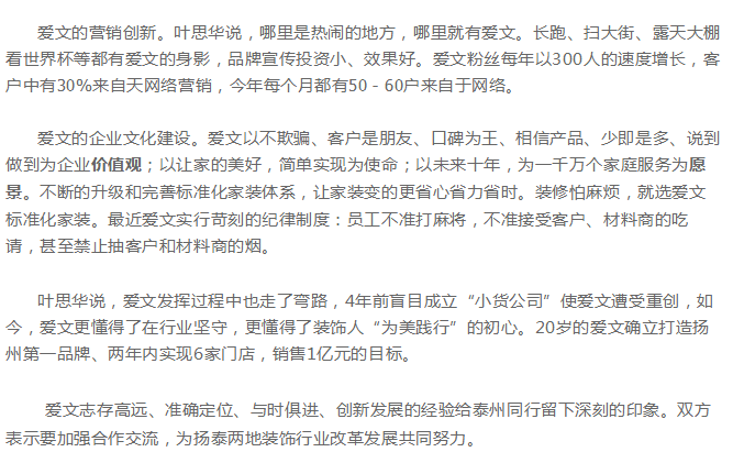 叶思华认为,企业逆势成长源于“立足扬州、坚守扬州、服务扬州”正确的定位。根据自身的能力和资源,把企业定位于打造区域的龙头企业,守住越来越小的这块蛋糕。坚持质量、诚信的企业底线。坚定不移地贯彻质量标准,不断的升级和完善标准化家装体系,2017年,爱文编制的住宅装修服务标准成为江苏省地方标准。