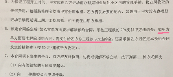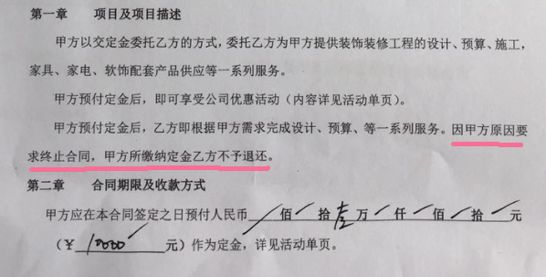 1、合同预付款不退。很多装修合同(收据)都在预付款后面加了 “不退”字样,例如天地和装饰预交1万元定金时在收据上注明“不退”;云潮装饰则注明:“如甲方单方面要求解除预约合同,需支付给乙方总工程款的20%违约金”。