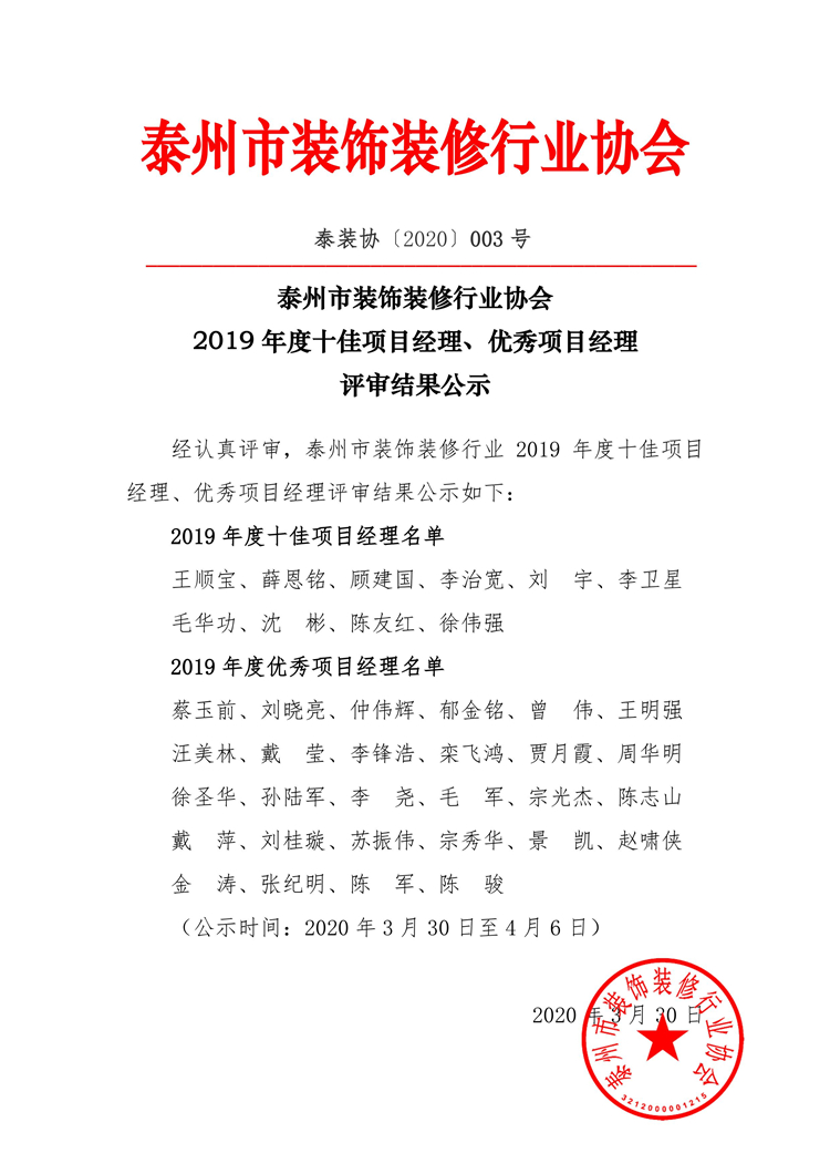 泰州市装饰装修行业协会2019年度十佳项目经理、优秀项目经理评审结果公示