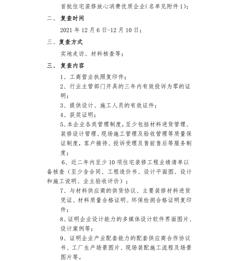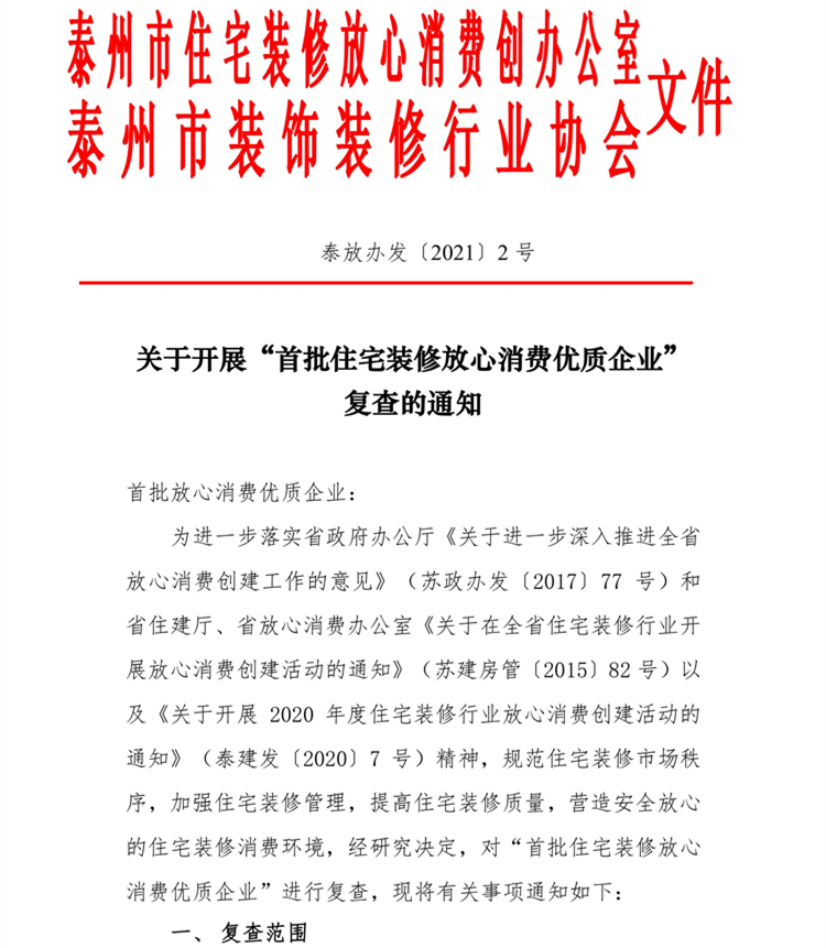 关于开展“首批住宅装修放心消费优质企业” 复查的通知