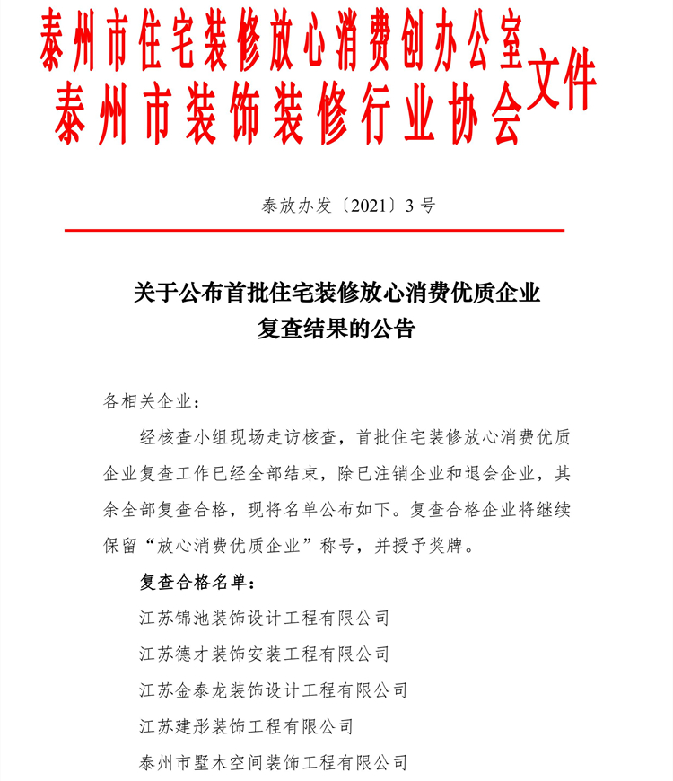 关于公布首批住宅装修放心消费优质企业复查结果的公告